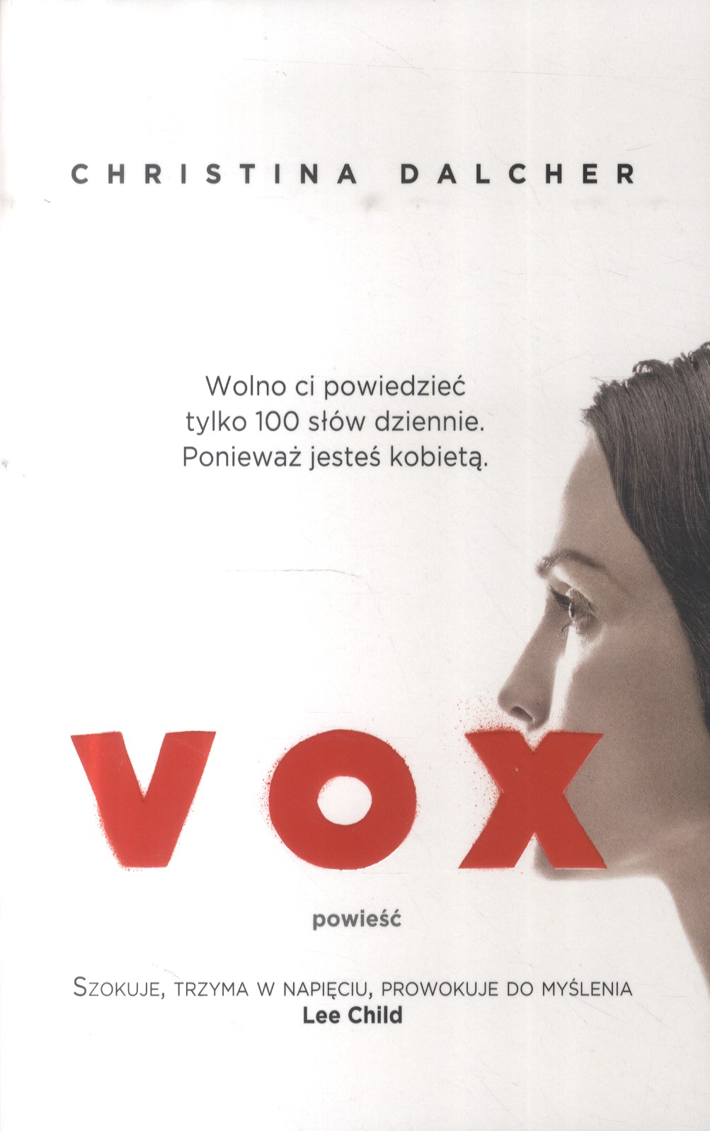 Co zrobiłyby kobiety, gdyby nagle liczba słów, które wypowiadają każdego dnia, uległa drastycznemu ograniczeniu? Feministyczna dystopia o świecie rządzonym przez mężczyzn, w którym kobiety mogą wypowiedzieć tylko 100 słów dziennie. Mocna, wzbudzająca emocje książka, ważny głos w epoce ruchu #MeToo i w świetle ogólnoświatowych dyskusji o prawach kobiet. Czarna bransoletka zaciśnięta na nadgarstku. Cyfrowe znaczki układają się w liczbę 15. Liczba wypowiedzianych słów nie może przekroczyć 100, każde kolejne słowo oznacza coraz silniejszy ładunek elektryczny. Licznik zresetuje się o północy. Zasady są proste: najlepiej usunąć wszystkie językowe ozdobniki, ograniczyć pytania do tych, na które wystarczy odpowiedzieć „tak” lub „nie”. Nie pytać dzieci, jak poszło w szkole. Nie rozmawiać z mężem, nie wdawać się w dyskusje. Ważyć każde słowo. Neurolingwistka dr Jean McClellan wciąż nie potrafi powiedzieć, jak się znalazła w tej utopistycznej rzeczywistości, gdzie rola wszystkich kobiet została ograniczona do milczącej obecności, do zapewniania rodzinie ciepłego posiłku na stole i czystego lokum. Jak do tego doszło? Kiedy, dosłownie i w przenośni, kobiety zostały zakute w kajdany? Recenzenci podkreślają, że Vox to „kawał dobrej literatury. Porusza, skłania do refleksji, inspiruje, rozpala emocje. Jest fenomenalna i niebagatelna. To jedna z tych książek, o których chce się opowiedzieć wszystkim dookoła”.